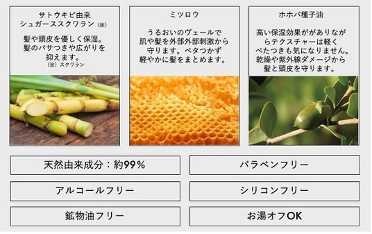 また、ミツロウやホホバ種子油など天然由来の保湿成分が髪に適度な潤いを与えながらもべたつかず、さらっとした使用感です。