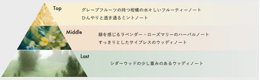 グレープフルーツの持つ水々しいフルーティーな香りとひんやりと透き通るミントの香りの中に、緑を感じるラベンダー・ローズマリーの香りとすっきりとしたサイプレスのウッディ調が交わり合い、最後に少し重みのあるシダーウッドの香りが印象的なブレンド。