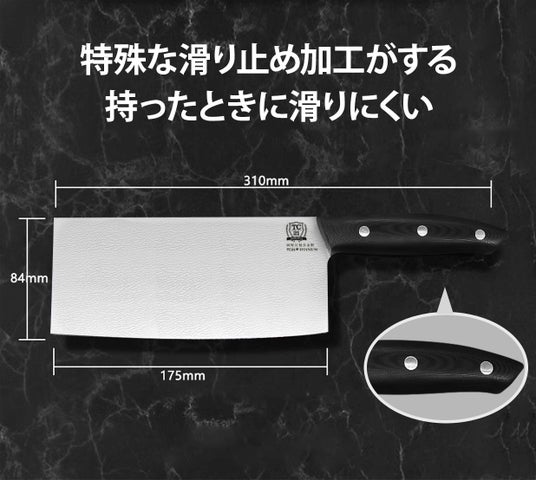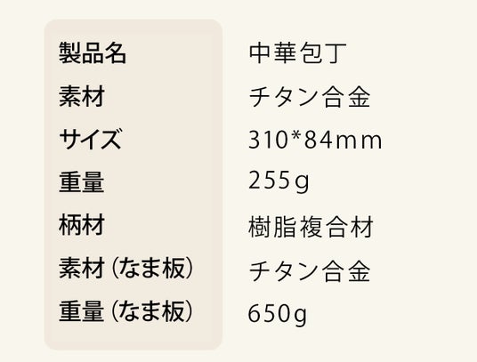 チタン合金で制作、軽量から使いこなす!255gの重さとサイズ感、使い勝手がちょうど良い;中華包丁は万能!使いやすいデザインで、切る、削ぐ、たたく、潰す、面取り、飾り切りなども自由自在