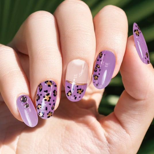 ブルべ系カラーのインスタドライ ネイルカラー 460 トラベリングライトにレオパード柄をオンすることで、トレンド感をとりいれつつ、大人クールな印象の指先に!