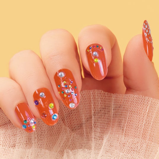夏のイベントシーズンにぴったりなオレンジカラー、インスタドライ ネイルカラー 356 ビーチユートゥイットに気持ちがあがるカラフルストーンをデコっておしゃれでアクティブなルックに!
