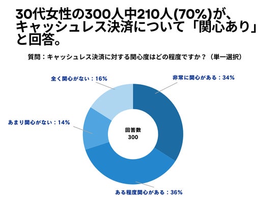 30代女性の300人を対象とした「キャッシュレス決済に対する関心度はどの程度ですか?」というアンケートで210人(70%)が「キャッシュレス決済について関心あり」という結果になりました。