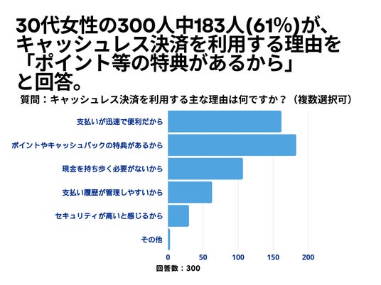 30代女性の300人を対象とした「キャッシュレス決済を利用する主な理由は何ですか?」というアンケートで183人(61%)が「ポイント等の特典があるから」という結果になりました。