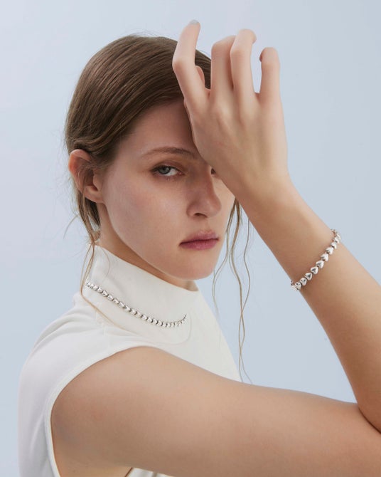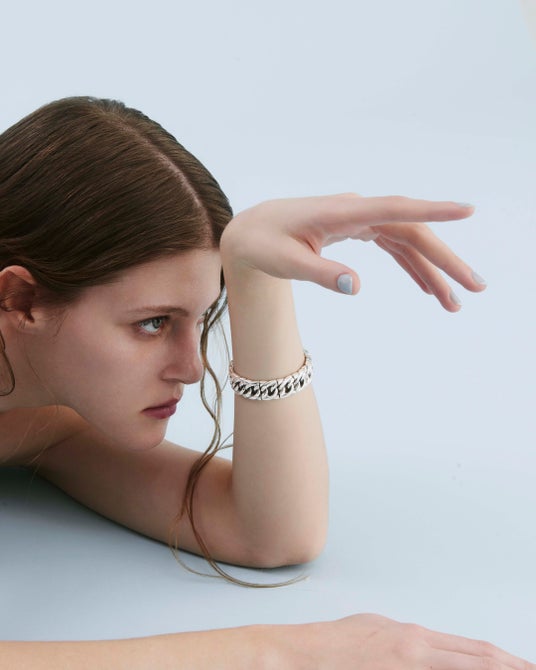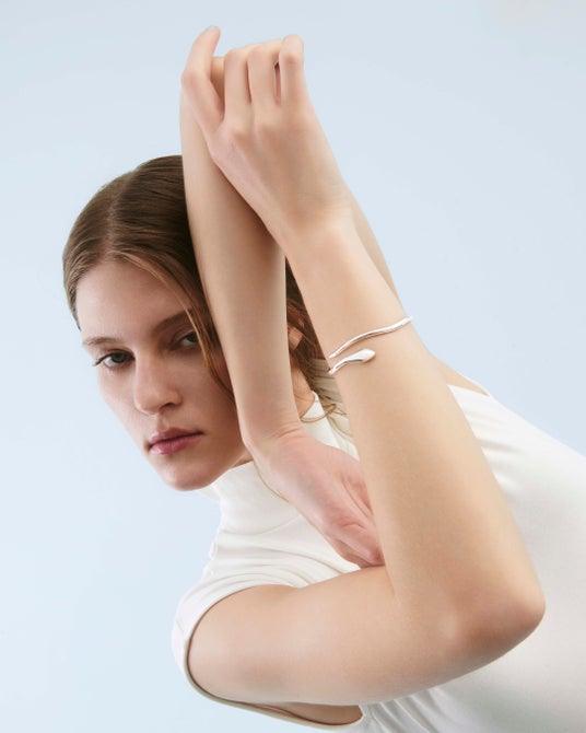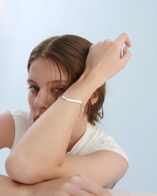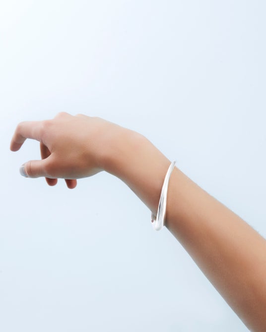 艶やかなシルバーが身につける人の身体のラインに沿い、しなやかに手首を包む