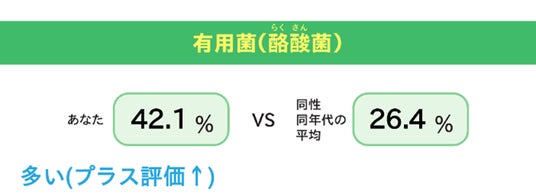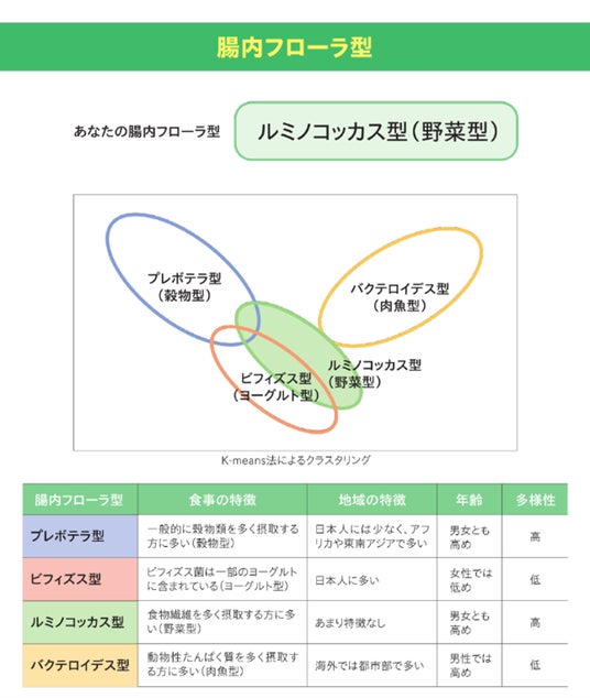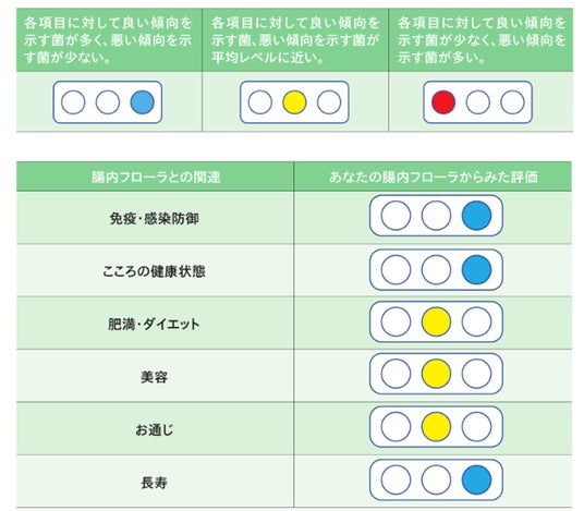 「腸サポ」は、青森県の弘前大学が2005年より毎年実施している、弘前市(岩木地区)で約1,000名を対象とした岩木健康増進プロジェクト健診の“ビッグデータ”に基づき腸内フローラのパイオニアである株式会社テクノスルガ・ラボが解析を行っており、独自の基準株データベースを用い根拠に基づいて細菌の割合を算出しております。「腸サポ」では、日本人の同世代同年代の平均値と比べた腸内総合評価や有用菌量、腸年齢、自分の腸内フローラ型が分かる他、健康度と腸内フローラとの関連として「免疫・感染防御」「こころの健康状態」「肥満・ダイエット」「美容」「お通じ」「長寿」の6項目の評価が「良い・普通・悪い」の3段階で分かるため、ご自身の腸内フローラを詳細に把握することができます。