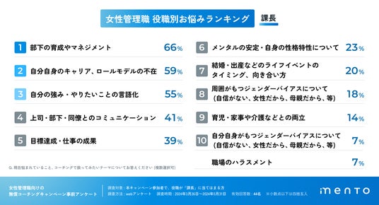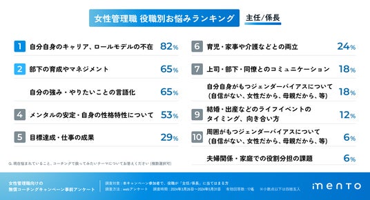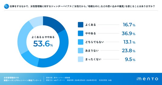 企業の中間管理職にマネジメントコーチ「mento for Business」を提供する株式会社mento(本社:東京都渋谷区、代表取締役:木村憲仁、以下mento)は、女性管理職へ無償コーチングを提供するチャリティキャンペーン(提供期間:2024年3月22日~2024年5月31日)において参加者を対象にアンケート調査(事前アンケート78名、事後アンケート84名)を実施いたしました。内閣府が推進する男女共同参画週間(6月23日~6月29日)にあわせて、アンケート結果に基づき以下の3つについてご報告いたします。(資料URL:https://x.gd/0jzZj)