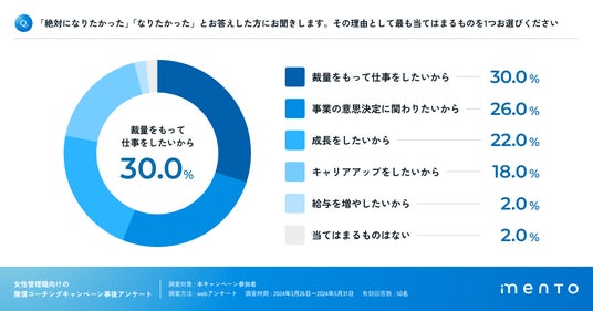 管理職になりたかった理由としては、「裁量を持って仕事をしたいから」(30.0%)、「事業の意思決定に関わりたいから」(26.0%)、「成長をしたいから」(22.0%)、「キャリアアップをしたいから」(18.0%)、「給与を増やしたいから」(2.0%)という結果になりました。