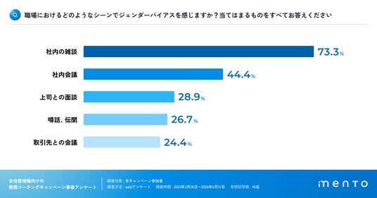 職場でジェンダーバイアスを感じるシーンは、「社内の雑談」(73.3%)が最も多く、次いで「社内会議」(44.4%)、「上司との面談」(28.9%)、「噂話、伝聞」(26.7%)、「取引先との会議」(24.4%)となりました。