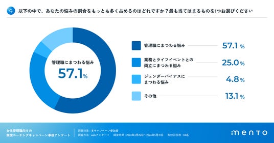 もっとも多く占める悩みの割合は「管理職にまつわる悩み」(57.1%)が最多、次いで「業務とライフイベントとの両立にまつわる悩み」(25.0%)、「ジェンダーバイアスにまつわる悩み」(4.8%)となりました。