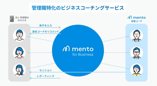 「mento for Business(メントフォービジネス)」は、リーダーの本音を引き出して組織を変える、マネジメントコーチングサービスです。企業の皆様に高品質なコーチングをより手軽に使っていただけるプラットフォームをオンラインで展開しています。これまでに累計40,000時間以上のコーチングを提供しており、登録コーチは約200名にのぼります。2020年のリリース以降、パナソニック、伊藤忠、電通をはじめとする大手企業を中心に導入が広まっています。