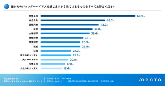 「誰からのジェンダーバイアスを感じますか?」という質問に対しては、「男性上司」(68.9%)、「自分自身」(46.7%)、「男性同僚」(42.2%)、「母親」(37.8%)、「女性部下」(35.6%)、「女性同僚」(31.1%)、「男性部下」(28.9%)、「親戚」(28.9%)、「父親」(22.2%)、「男性の知人・友人」(22.2%)、「夫・パートナー」(20.0%)、「女性上司」(17.8%)、「女性の知人・友人」(15.6%)という結果になりました。
