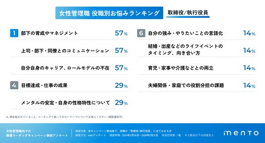 取締役/執行役員のお悩みランキングは「部下の育成やマネジメント」(57%)、「上司・部下・同僚とのコミュニケーション」(57%)、「自分自身のキャリア、ロールモデルの不在」(57%)が同率1位となりました。