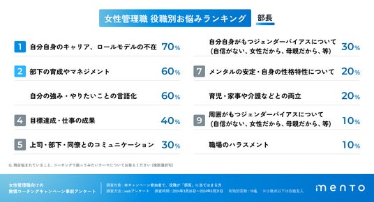 あらゆる企業において女性活躍が求められるなか、中間管理職を中心にコーチングを提供するmentoでは、3月8日の「国際女性デー」にあわせて女性管理職へ無償コーチングを提供するチャリティキャンペーンを実施。(※2)参加者を対象にアンケート調査をおこないましたので、その結果を報告いたします。(全調査結果の資料URL:https://x.gd/0jzZj)