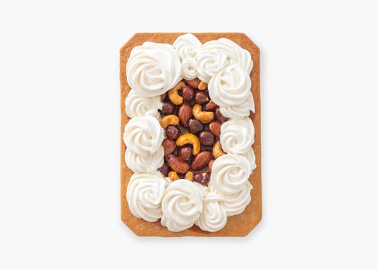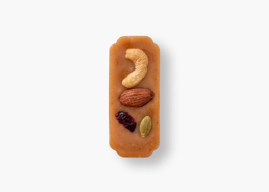 バターを煮込んだカリカリのトフィーをミルフィーユサブレにのせ、ローストアーモンド、カシューナッツ、かぼちゃの種とドライフルーツをトッピング「トフィー」¥418(税込)