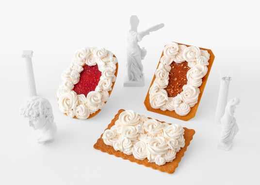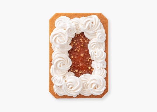 27層に折りたたんだミルフィーユサブレを大判(13cm×18.5cm)に焼き、フリルの花束のように絞ったバニラメレンゲの中にコンフィチュールやキャラメルをのせ、更に一晩かけてじっくり焼き上げました。サブレ生地とメレンゲ生地のクリスピー食感と、コンフィチュールやキャラメルがしみ込んだサブレのしっとり感が複雑に絡み合い、今までにない新洋菓子となっています。