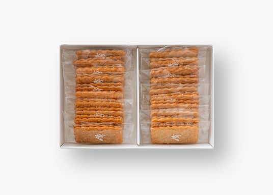 白ザラ糖をトッピングして焼き上げたミルフィーユサブレ。13cm×18.5cmの大判サイズなので、味だけではなくボリューム感も。「シュガーグラン」4枚入り¥3,200(税込)