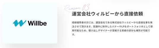 受講者の中で成績優秀者の方にはWillCan認定パートナーの称号を付与します。 認定パートナーに選ばれた方には、運営会社である株式会社ウィルビーから、直接WEBデザインの仕事を発注させて頂きます。