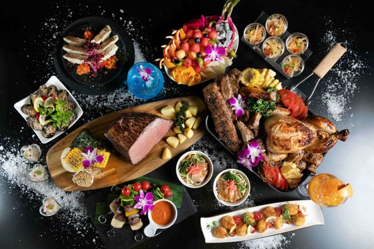 カフェレストラン「ナトゥーラ」では、ホテル開業60周年を記念した夏の特別ブッフェを開催いたします。ランチの鉄板焼コーナーでは、「牛ハラミステーキ」の食べ放題をはじめ、豚肩ロースのポリネシアン風やチキンリブとチキンケバブ風盛り合わせなど、食欲をそそる肉料理の数々が並びます。またガーリックシュリンプやタコライスなど異国情緒あふれるグルメもお楽しみいただけます。
