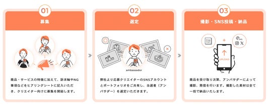 商品やサービスの撮影・発信を行うアンバサダーを募集し、企業独自のUGCを大量に作成出来るプランです。熱量が高く、リアルな視点でのUGCは、SNS上でユーザーの共感を呼ぶことに繋がりファン層の拡大と育成に貢献します。集まった素材や投稿は無期限多用途に二次利用可能です。
