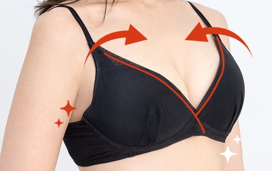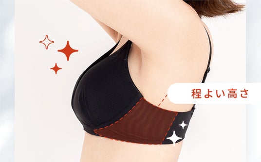 サイドボーンを使用せず、程よい高さで生地を広げることで痛みを防ぎながらバストの横流れを防止。