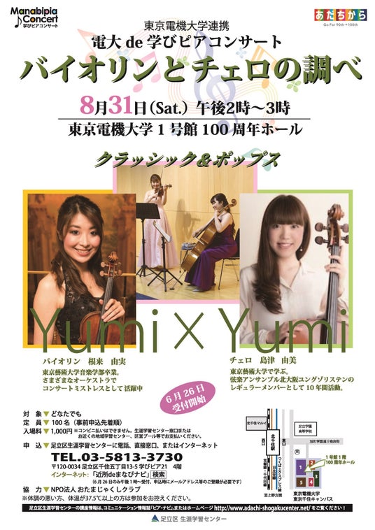 東京電機大学(学長 射場本忠彦)が協力する足立区生涯学習センターとの地域連携企画であるバイオリンとチェロのデュオ「Yumi×Yumi」によるコンサート、「電大 de 学びピアコンサート バイオリンとチェロの調べ」が、8月31日(土)に東京千住キャンパス(東京都足立区)で開催されます。「Yumi×Yumi」は、オーケストラでコンサートミストレスとしても活躍中のバイオリン奏者 根来由実さんと、弦楽アンサンブル北大阪ユングゾリステンのレギュラーメンバーとして10年間活動経験のあるチェロ奏者 島津由美さんによるデュオ。当日は、クラシックとポップスの曲目をお楽しみいただきます。