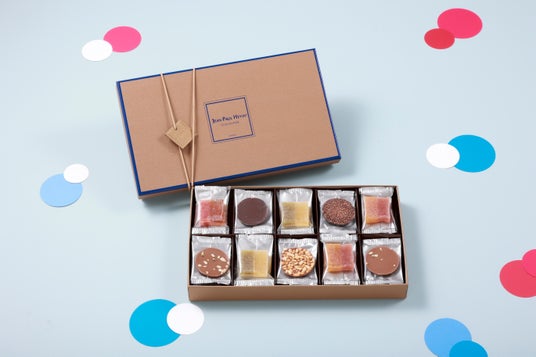 期間限定のパート ドゥ フリュイ10個(フレーズ ユズ、ルバーブ マング、キウイ ジャンジャンブル)とプティ パレ10枚の詰合せ。