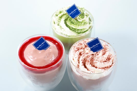 右:グラス ピレ オ ショコラ 左:グラス ピレ オ ショコラ フランボワーズ マント 中央:グラス ピレ オ ショコラ マッチャ