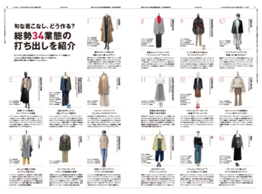 特集冒頭では「トレンドの素材は?」「色や柄は何が売れそう?」「暖冬対策は?」といった6つのギモンに、ウィメンズリアルトレンドをウォッチしてきた特集担当記者がお答え。キーワードやトレンドを整理できたら、総勢34業態のイチオシルックをご紹介。きっとこの秋冬を戦う上でのヒントが見つかるはずです。