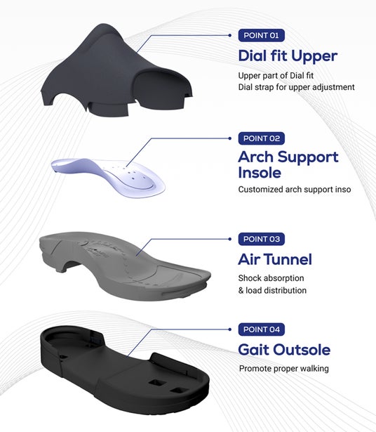 衝撃吸収と荷重分散を実現する特製ソールにより、足のアーチが適切にサポートされることで、歩行時の足への荷重が分散されます。
