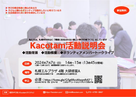 認定NPO法人Kacotam(カコタム、[所在地] 北海道札幌市、[理事長] 高橋勇造)は、活動説明会を、7月7日(日)に札幌エルプラザ(札幌市北区北8条西3丁目)にて開催します。