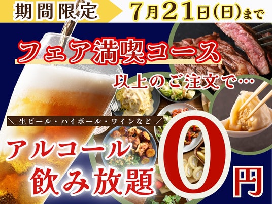 2024年7月21日(日)迄の期間、フェア満喫コース以上のご予約にて、生ビールやハイボール、焼酎、ワインなどの豊富なラインナップでお楽しみいただける120分制の『アルコール飲み放題 税込825円』がなんと『無料』でご利用いただけます!