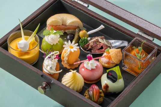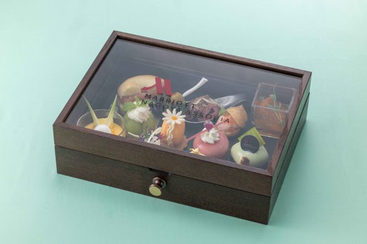 煌めく夏の宝石のような色とりどりのスイーツとセイボリーをオリジナルの“ジュエリーBOX”に詰め込んだ夏のコレクション。シャインマスカットのタルトや桃のムースなどスイーツ8種類に加えて、幻の黄金トマト ティアラムを使ったトマトコンソメジュレ、グラナパダーノを添えたローストビーフも登場します。