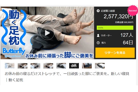 2024年6月26日から応援購入サイト「Makuake(マクアケ)」にて先行販売中の、株式会社ロウダン(本社:愛知県春日井市/代表:志水孝至)が展開する自社ブランドBlueBloodの新商品、動く寝具『エアテックシリーズ』の新モデル「バタフライフットピロー」が、6月27日現在達成率500%越えとなる【応援購入額2,500,000円】を突破しました。