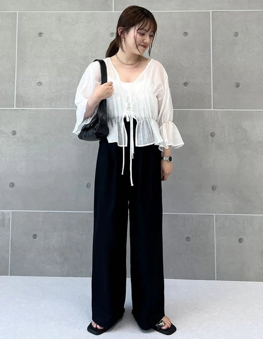 シンプルに、ホワイトとブラックでまとめ、素材感で夏らしさを取り入れたコーディネートを意識。