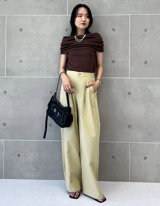 低身長でもスタイルアップできるように、コンパクトめな丈感を選びます◎ 骨格ストレートさんは、首の詰まったトップスよりも、このようなスクエアネックなどすっきりとしたデザインがおすすめ!