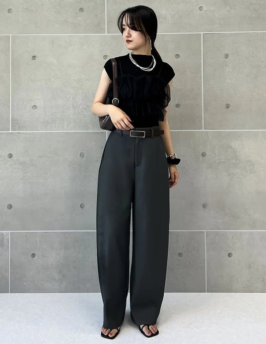 カーブシルエットで目線が下がらないように、ウエストはキュッと引き締めて足元もすっきり肌見せするのがおすすめです。