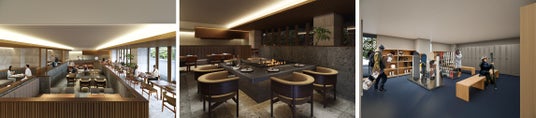左・中:レストラン完成予想CG、右:スキーロッカー完成予想CG