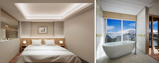 ※左:ベッドルーム完成予想CG(タイプI)、右:バスルーム完成予想CG(タイプJ)