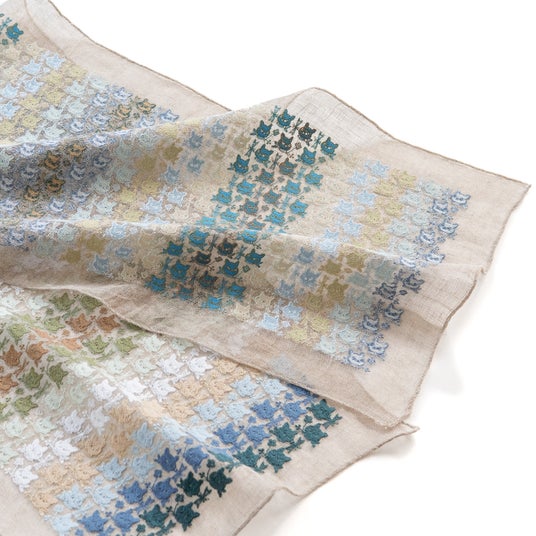 「草花クロッチ」は、都会の草原に暮らすのら猫クロッチがデザインされた、独特の魅力あふれるテキスタイルです。細部にまでこだわった美しい刺繍と、クロッチの愛らしい姿が、見る人の心を掴んで離しません。