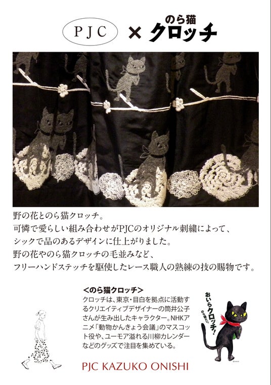 オリジナルレースのテキスタイル・服を製造・販売する株式会社ピー・ジェイ・シー(所在地:東京都豊島区、代表取締役:大西 和子)は、自社で展開するエンブロイダリーレースの老舗メゾン「PJC KAZUKO ONISHI」と人気キャラクター「のら猫クロッチ」とのコラボレーションテキスタイル「草花クロッチ」の再販を、2024年6月28日(金)より開始いたします。