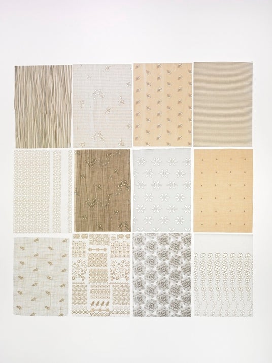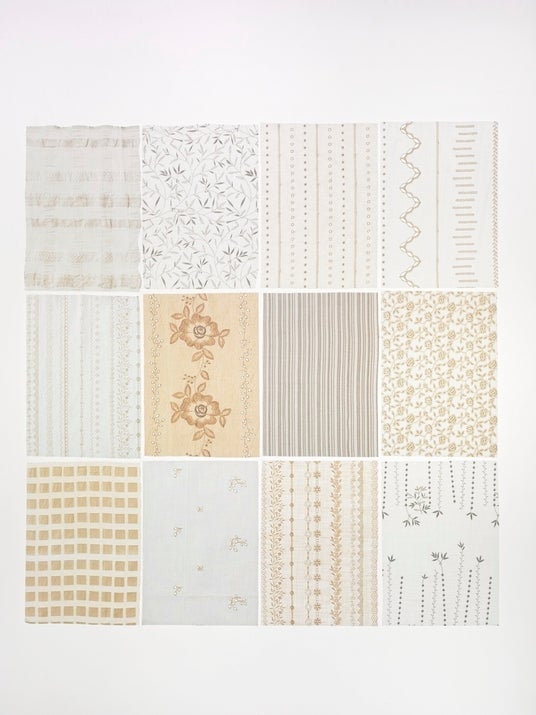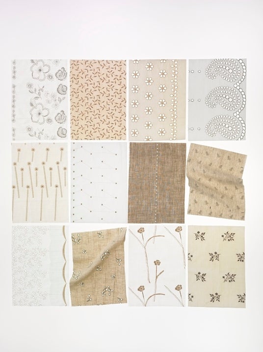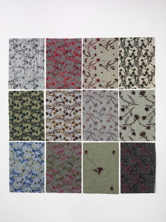 PJCのエンブレースを愛してくれるたくさんの人達との出会いの中で、徐々に増えていくオリジナルエンブレース。さまざまな花や草木、繰り返されることで生き生きとしてくる幾何模様。それらのエンブレースがまた次の新たな素材を生みだしていきます。