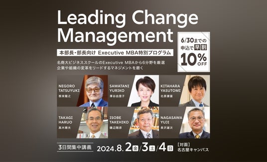 名古屋商科大学ビジネススクールは、日経ビジネススクールとの連携プログラム第2弾として、企業や組織の本部長や部長に求められるグローバルなゼネラルマネジメント能力を習得する特別プログラム「Leading Change Management 」を2024年8月2日~4日の3日間の対面集中型講座として実施いたします。本講座は、日経ビジネススクールとの連携プログラムで初めて開講する講座です。