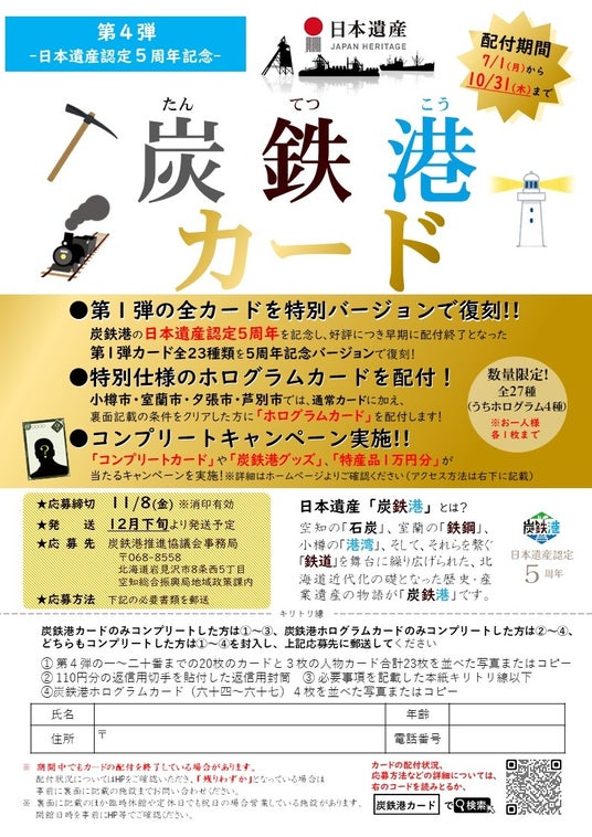 – 景品1.コンプリートカードプレゼント 第4弾カード27種のうちホログラムカードを除く第1弾炭鉄港カード復刻版23種類を集め、応募 いただいた方全員にプレゼント2.炭鉄港関連グッズ 第4弾カード27種のうちホログラムカードを除く第1弾炭鉄港カード復刻版23種類を集め、応募いただいた方から抽選で10名様にプレゼント3.特産品1万円分 ホログラムカード4種を集め、応募いただいた方から抽選で1名様にプレゼント