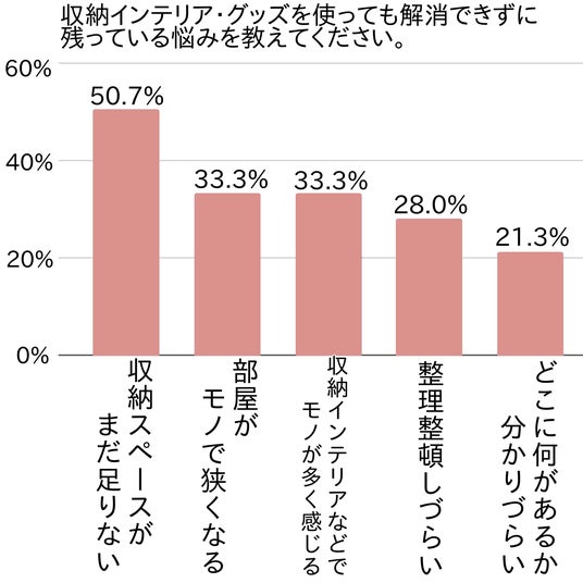 そこでアンケートでは、収納インテリア・グッズを使っても解消できず残っている悩みは何か尋ねてみました。