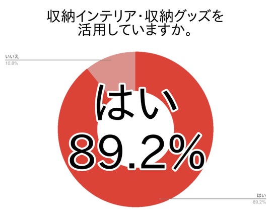 今回のアンケートでは、収納インテリア・収納グッズを活用していると答えた方は全国的に約9割(関東89.2%・全国88.8%)でした。