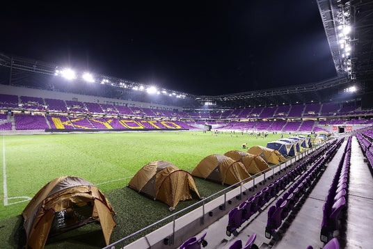 花火はスタジアムのスタンド席で観覧ができ、ピッチに張ったテントで宿泊ができます。