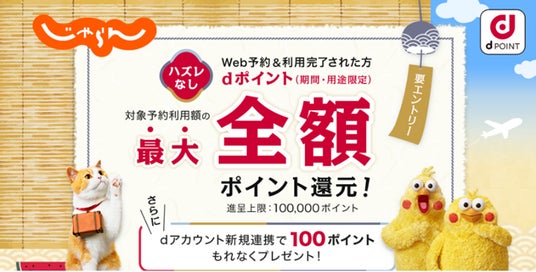 株式会社NTTドコモ(以下、ドコモ)は、株式会社リクルートが提供する旅行情報サービス「じゃらん net」において、「じゃらん netで最大全額ポイント還元キャンペーン~ハズレなし~」(以下、本キャンペーン)を2024年7月1日(月)から2024年9月4日(水)までの期間で開催いたします。