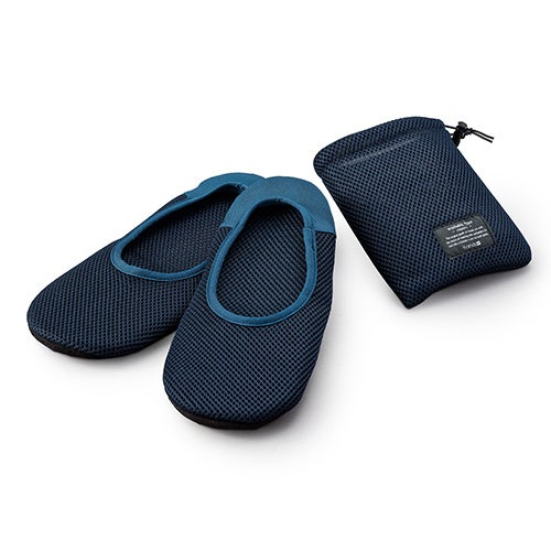 持ち運びに便利な巾着袋付き。メッシュ素材で優れたクッション性のスリッパです。長時間履いたりフィット感が欲しいときはかかとを入れてシューズのように、脱ぎ履きをスムーズに行いたいときはかかと部分を踏んでつっかけのように、シーンにあわせてご使用いただけます。