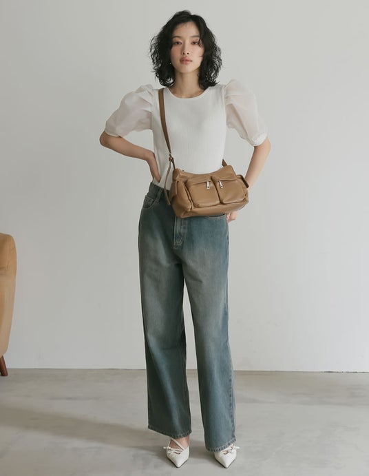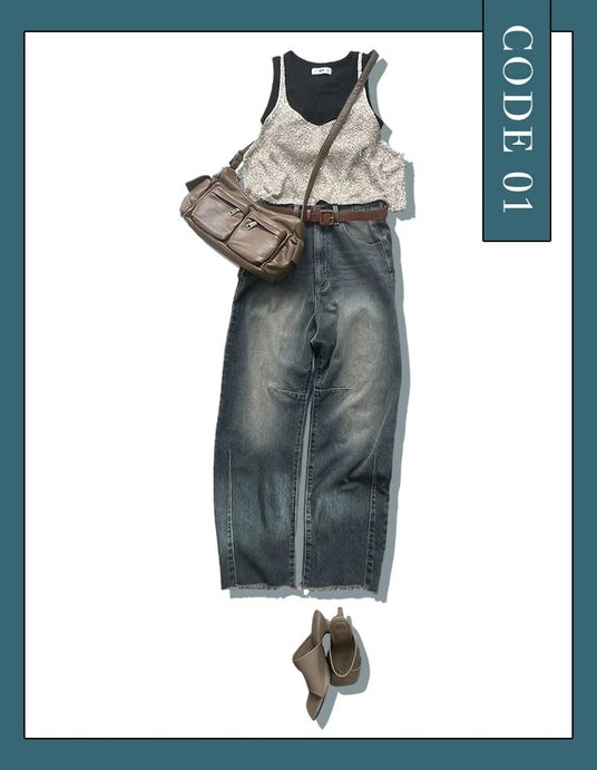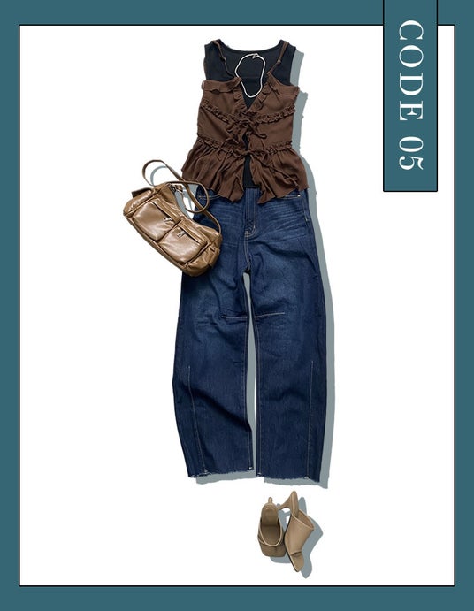 ウエスト周りがキュッとなるようなコンパクトなトップスと、ゆるっと感が旬のカーブデニムで脚を長く見せるバランスも意識。