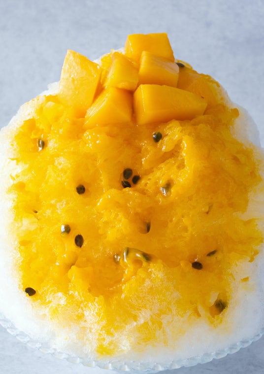 八ヶ岳の天然氷『蔵元八義』×『南国フルーツ』八ケ岳の天然氷蔵元八義を使用したかき氷は、まるで雪のようにふんわりとした食感と透明度の高い美しい見た目が特徴です。
